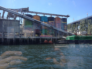 Once through customs it was about a three minute walk over to the Skytrain terminal and we immediately boarded the Skytrain, jumped off on the second stop in Downtown Vancouver and walked about 6 blocks to the Westin and our thoughtful daughter had called ahead and got us an early checkin. We dropped off our bags in the room and walked about 3/4 mile to the waterfront of False Creek and the Yaletown Ferry Dock. We boarded the Aquabus to Granville Island. The Market is a popular place to shop and eat with great 360 views of all the boating activity on False Creek that empty's into English Bay. English Bay serves a s a huge anchorage for commercial shipping as well as the body of water used for local sailing regattas, and boating of all sorts. Constant boat traffic in and out of False Creek day and night.